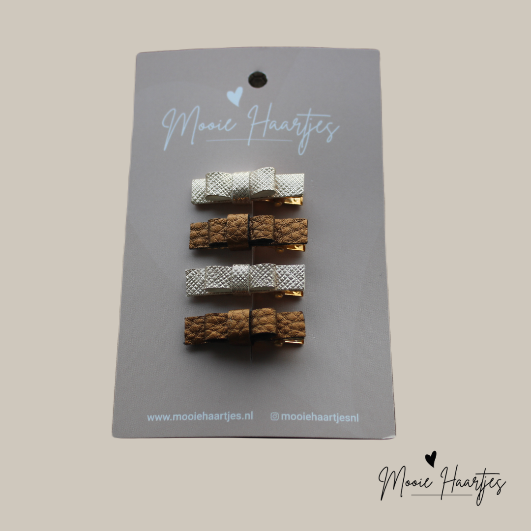 Hoe schattig staan deze alligator haarspeldjes met kleine strikjes in de haren van je peuter. Deze warme aardetinten passen perfect bij de laatste modetrends.