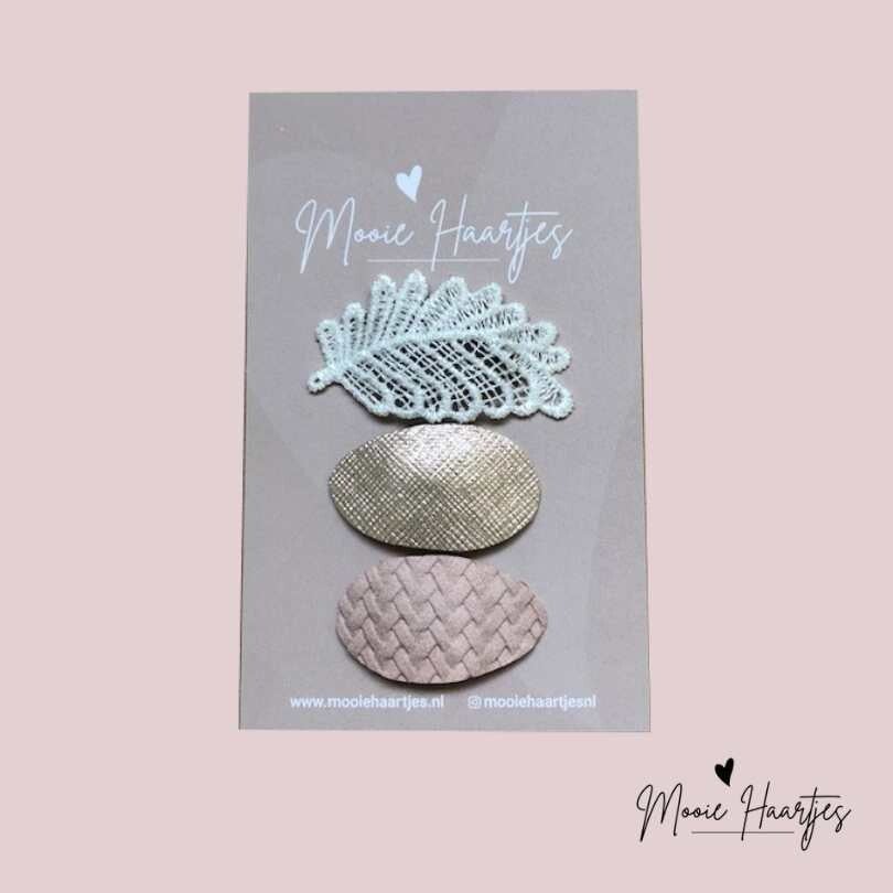 Een veertje en 2 leatherlook antislip clipjes. Dit setje is subtiel maar staat prachtig in korte dunne haartjes.